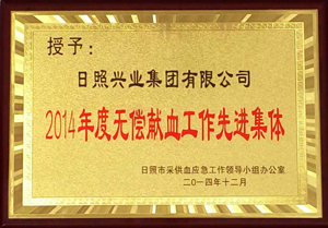 ·2014年12月,授予興業(yè)集團(tuán)2014年底無償獻(xiàn)血工作先進(jìn)集團(tuán)稱號(hào)