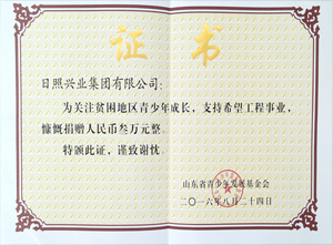 ·2016年8月24日,山東省青少年發(fā)展基金會為興業(yè)集團頒發(fā)“關(guān)注貧困地區(qū)青少年成長,支持希望工程事業(yè),慷慨捐贈人民幣3萬元”榮獲證書。