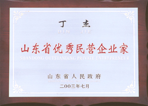 · 2003年7月,授予丁杰董事長(zhǎng)“山東省優(yōu)秀民營(yíng)企業(yè)家”榮譽(yù)稱(chēng)號(hào)