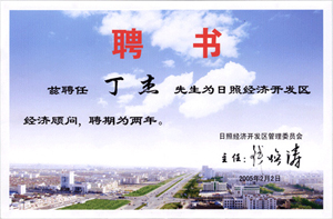 · 2005年2月2日,茲聘任丁杰董事長(zhǎng)日照經(jīng)濟(jì)開(kāi)發(fā)區(qū)經(jīng)濟(jì)顧問(wèn)