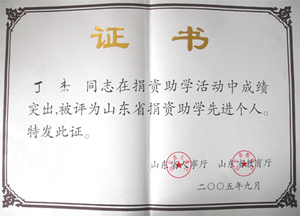 · 2005年9月,丁杰董事長(zhǎng)榮獲“山東省捐資助學(xué)先進(jìn)個(gè)人”榮譽(yù)稱(chēng)號(hào)
