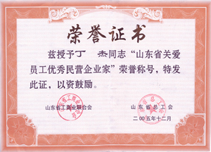 · 2005年12月,丁杰董事長(zhǎng)榮獲“山東省關(guān)愛(ài)員工優(yōu)秀民營(yíng)企業(yè)家”榮譽(yù)稱(chēng)號(hào)
