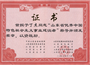 · 2007年12月,丁杰董事長(zhǎng)榮獲“山東省優(yōu)秀中國(guó)特色社會(huì)主義事業(yè)建設(shè)者”榮譽(yù)稱(chēng)號(hào)