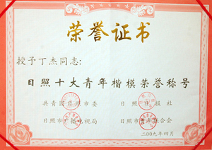 · 2009年4月,丁杰董事長(zhǎng)榮獲“日照楷模十大青年”榮譽(yù)稱(chēng)號(hào)
