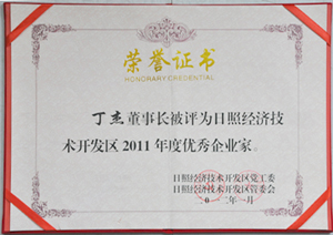 ·2012年1月,丁杰董事長(zhǎng)被評(píng)為“日照市經(jīng)濟(jì)技術(shù)開(kāi)發(fā)區(qū)優(yōu)秀企業(yè)家”榮譽(yù)稱(chēng)號(hào)