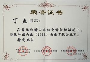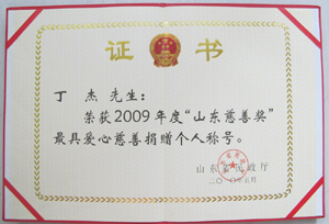· 2009年5月,丁杰董事長(zhǎng)榮獲“山東慈善獎(jiǎng)”最具愛(ài)心慈善捐贈(zèng)個(gè)人榮譽(yù)稱(chēng)號(hào)