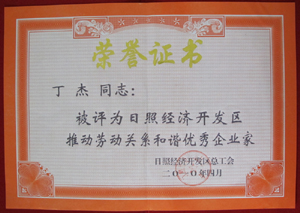 · 2010年4月,丁杰董事長(zhǎng)榮獲“日照經(jīng)濟(jì)開(kāi)發(fā)區(qū)推動(dòng)勞動(dòng)關(guān)系和諧優(yōu)秀企業(yè)家”榮譽(yù)稱(chēng)號(hào)