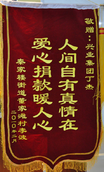 · 2010年2月,敬贈(zèng)興業(yè)集團(tuán)董事長(zhǎng)丁杰“人間自有真情在,愛(ài)心捐款暖人心”錦旗