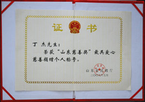 ·2010年5月,丁杰董事長(zhǎng)被評(píng)為2009年度“山東慈善獎(jiǎng)”最具愛(ài)心慈善捐贈(zèng)個(gè)人