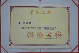 · 2008年5月,丁杰董事長(zhǎng)榮獲“2007年度慈善之星”榮譽(yù)稱(chēng)號(hào)