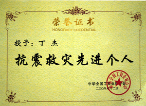 · 2008年12月,丁杰董事長(zhǎng)榮獲“抗震救災(zāi)先進(jìn)個(gè)人”榮譽(yù)稱(chēng)號(hào)