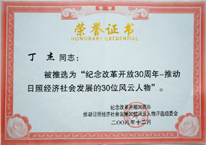 · 2008年12月,丁杰董事長(zhǎng)被評(píng)為“紀(jì)念改革開(kāi)放30周年風(fēng)云人物-推動(dòng)日照社會(huì)經(jīng)濟(jì)發(fā)展的30位風(fēng)云人物”