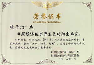 ·2015年2月,日照經(jīng)濟(jì)技術(shù)開(kāi)發(fā)區(qū)授予丁杰董事長(zhǎng)“日照經(jīng)濟(jì)技術(shù)開(kāi)發(fā)區(qū)功勛企業(yè)家”稱(chēng)號(hào)。