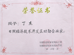 ·2016年1月,日照經(jīng)濟(jì)技術(shù)開(kāi)發(fā)區(qū)授予丁杰董事長(zhǎng)“日照經(jīng)濟(jì)技術(shù)開(kāi)發(fā)區(qū)功勛企業(yè)家”稱(chēng)號(hào)。