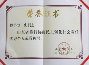 ·2015年12月,山東省總工會(huì)授予丁杰董事長(zhǎng)“山東省推行協(xié)商民主強(qiáng)化社會(huì)責(zé)任優(yōu)秀個(gè)人”榮譽(yù)稱(chēng)號(hào)。