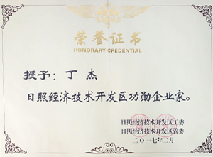 ·2017年2月,日照經(jīng)濟(jì)技術(shù)開(kāi)發(fā)區(qū)授予丁杰董事長(zhǎng)“日照經(jīng)濟(jì)技術(shù)開(kāi)發(fā)區(qū)功勛企業(yè)家”稱(chēng)號(hào)。
