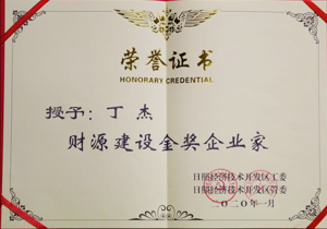 ·2020年1月,日照經(jīng)濟(jì)技術(shù)開(kāi)發(fā)區(qū)授予丁杰“財(cái)源建設(shè)金獎(jiǎng)企業(yè)家”